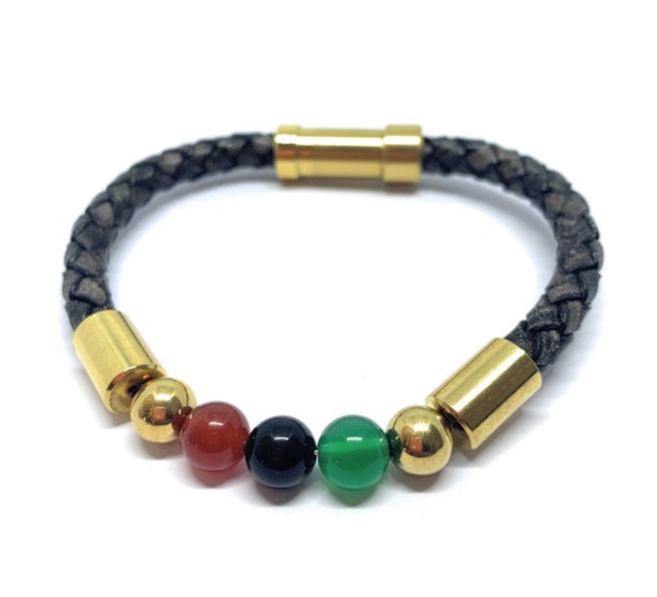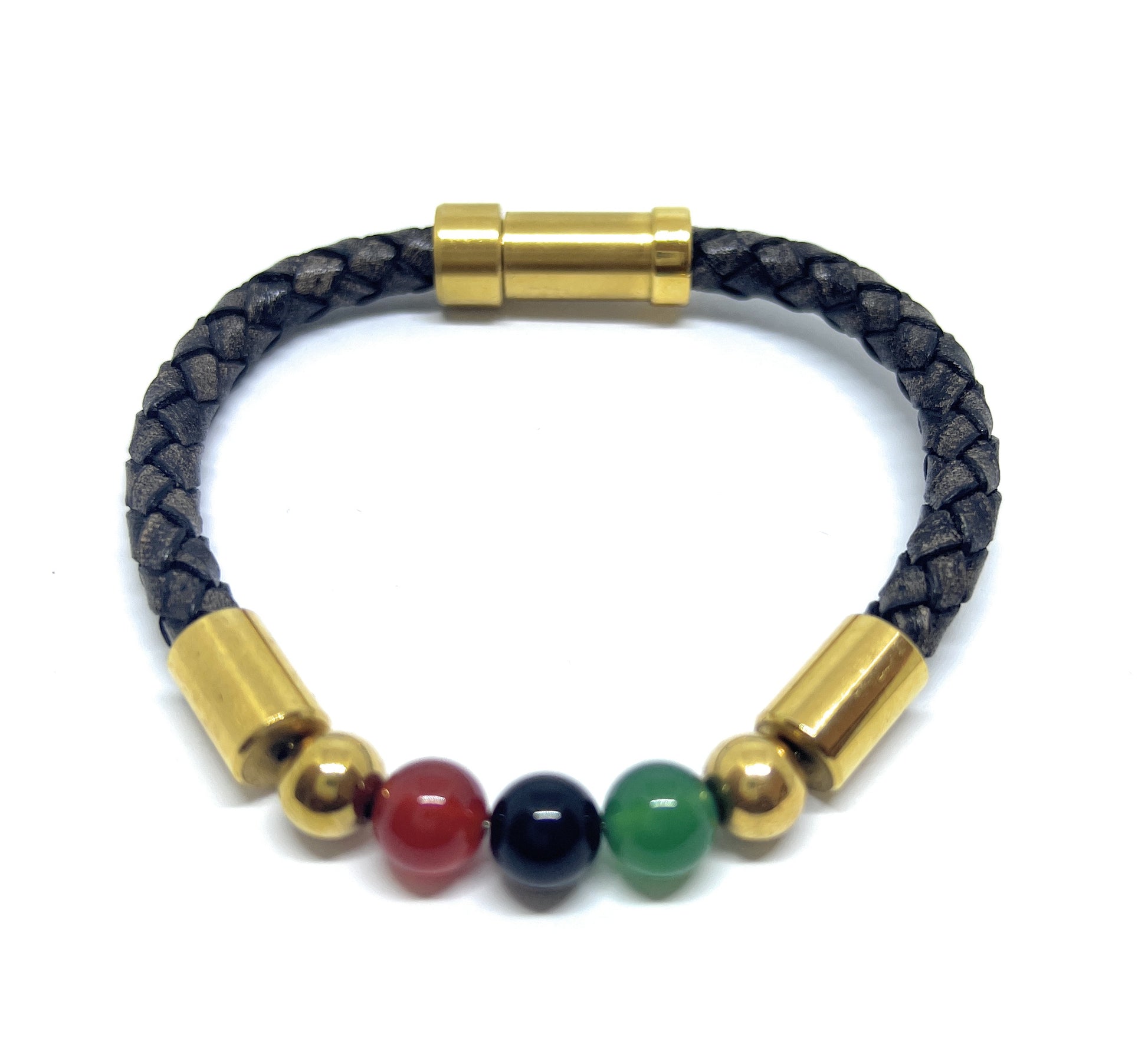 The Brass King Wealth Band is a bold Pan-African inspired bracelet crafted with a premium braided leather band and finished with solid brass accents for a rich, elevated look. Centered with red for courage, black for strength, and green for prosperity, this piece symbolizes power, identity, and progression. The combination of brass and leather creates a strong masculine aesthetic while honoring the legacy of Black excellence and wealth. Perfect for everyday wear, gifting, or stepping confidently into a season of abundance and purpose.